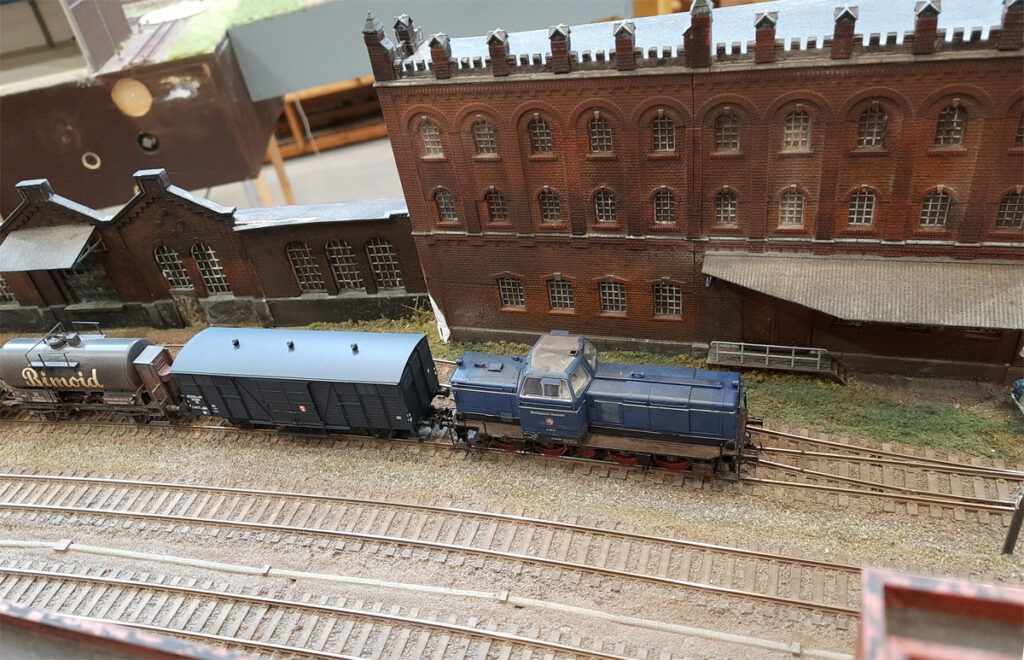 Kein größerer Bahnhof kommt ohne mindestens einen Kohlehändler mit eigenem Gleisanschluss aus. Auf dieser „Restecke“ war dafür ein guter Platz. Schwierig sind die Bedienfahrten, wenn Gleis 33 mit Ausgangswagen für die DB voll steht oder Löwengas erst leer gefahren werden muss. Aber so soll es sein. Der freundliche Besitzer unserer Tankstelle an der Ecke lieh den Namen.