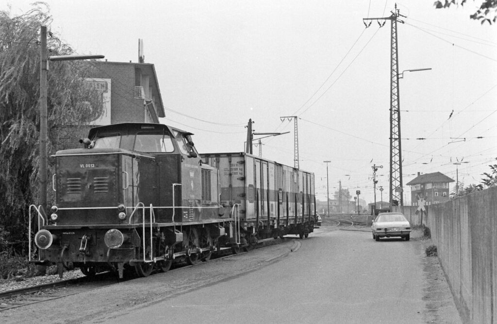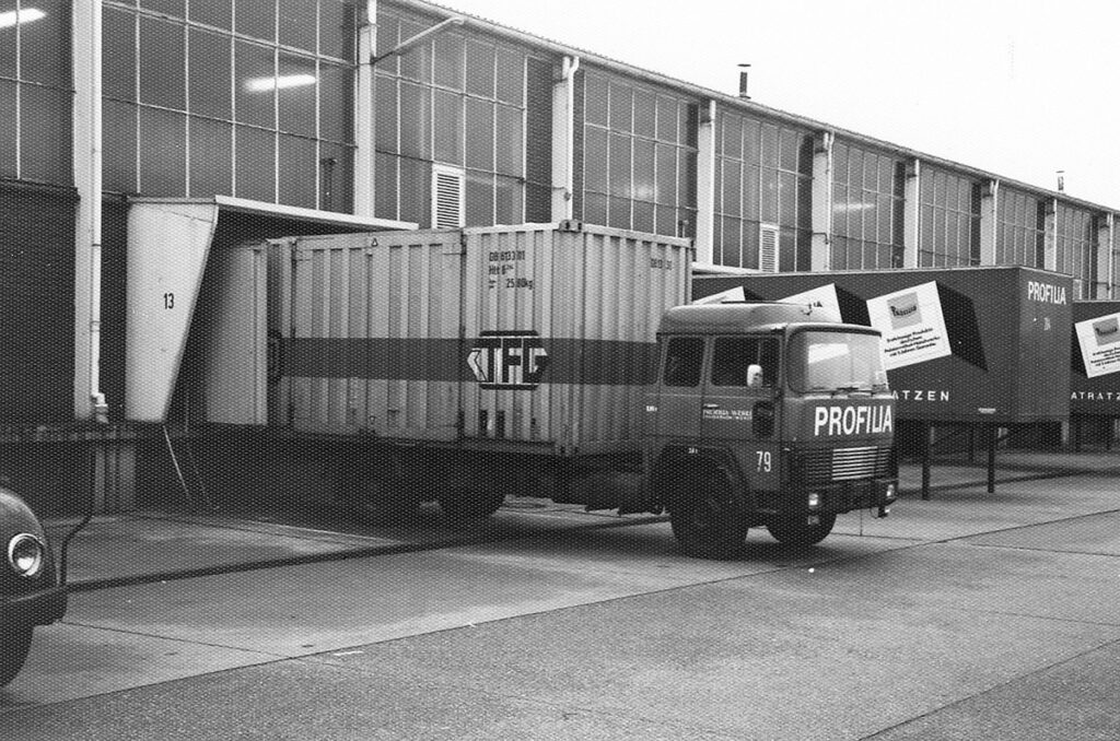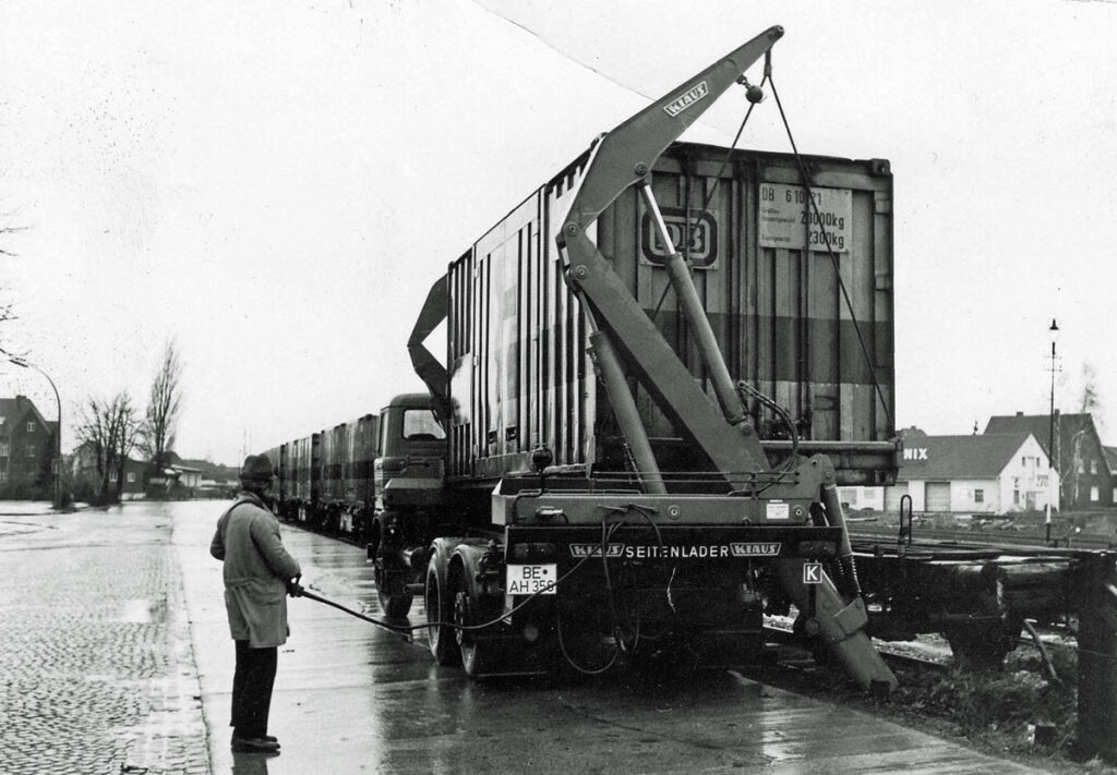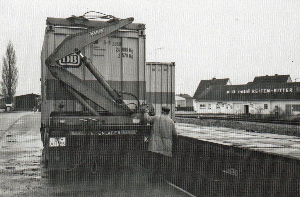 Beladen eines Containers am Warenausgang 1980, die Konkurenz in Form von Wechselbrücken ist bereits am Start (Foto: Archiv WLE)