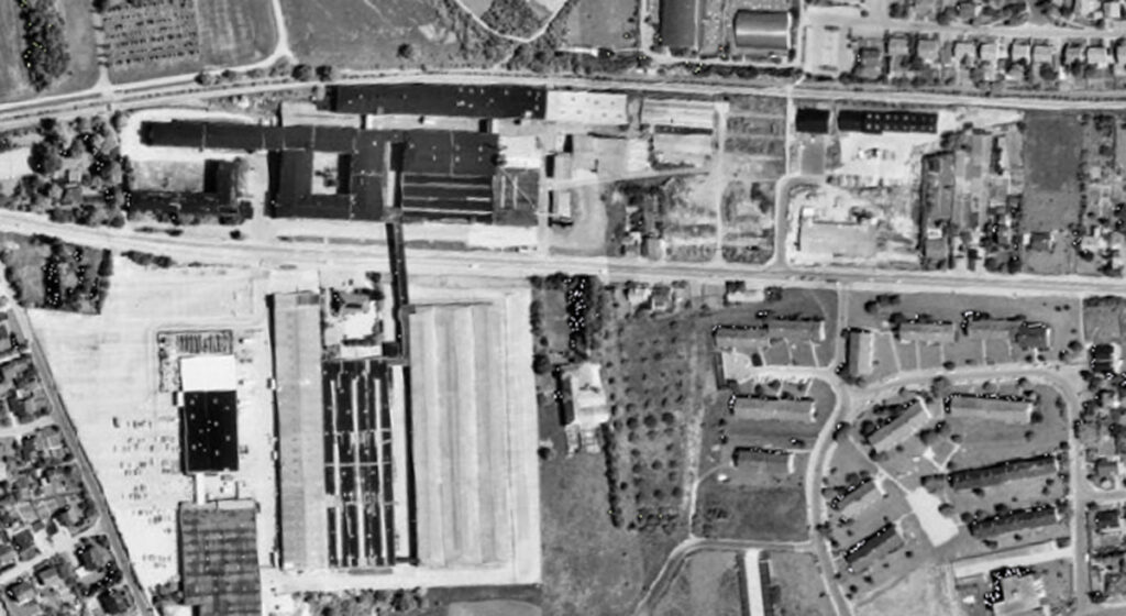 Luftbild 1986 mit der größten Ausdehnung incl. der Verbindungsbrücke in den Werkteil auf der anderen Straßenseite (Quelle: TIM Online)