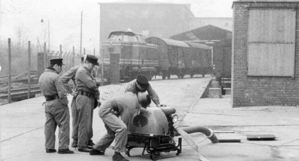 Bedienung mit einer TWE Leihlok in den 1970er Jahren. Im Vordergrund steht die Übung der Werksfeuerwehr (Foto: Sammlung WLE-Knipser)