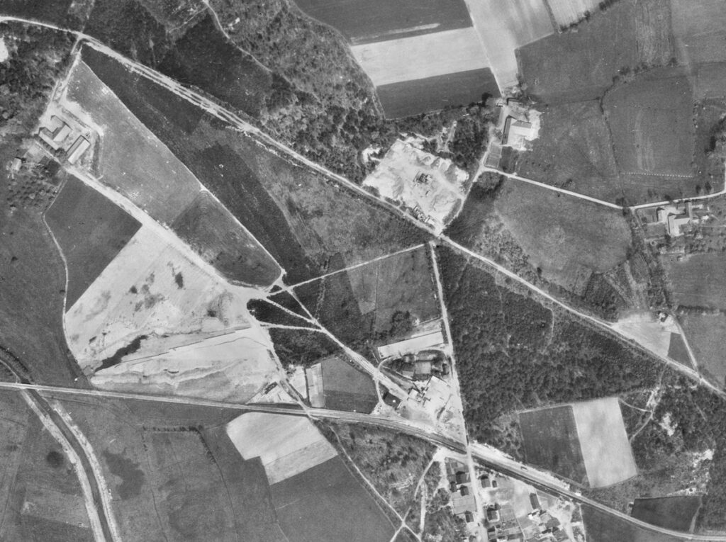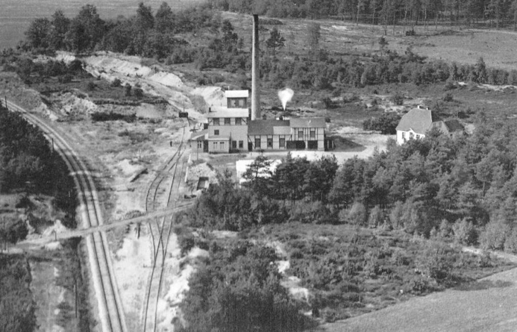 Es ist eine Entwicklung vom ersten (Schräg-) Luftbild zu dieser Aufnahme zu erkennen. Es liegen Feldbahngleise in Richtung der Hügel in nordwestlicher Richtung. Hier wird der Sand für die Herstellung abgebaut. Vor dem Werk, wo diese Gleise zusammenkommen, ist eine Art Aufstellbahnhof für Kipploren der Feldbahn zu sehen. Der Normalspuranschluß liegt jetzt an einer Ladestraße rechts der Straße zum Werk. Dies dürfte die im Fahrplan von 1971 vermerkte Anschlußstelle Teerschotter sein. Wer hat hier weitere Informationen.