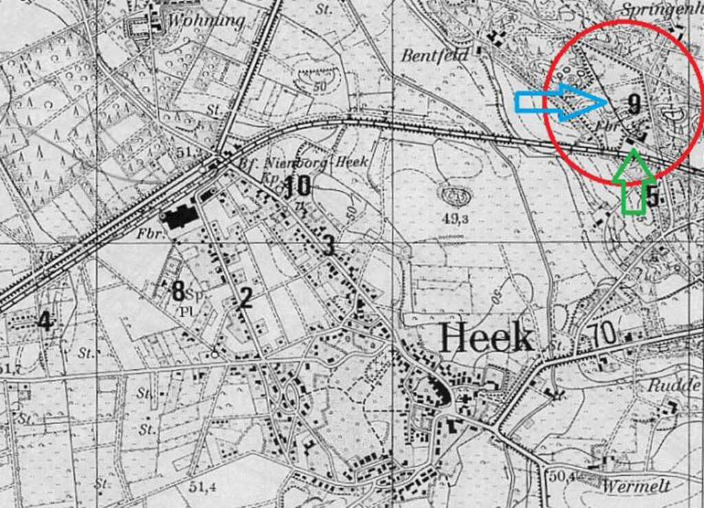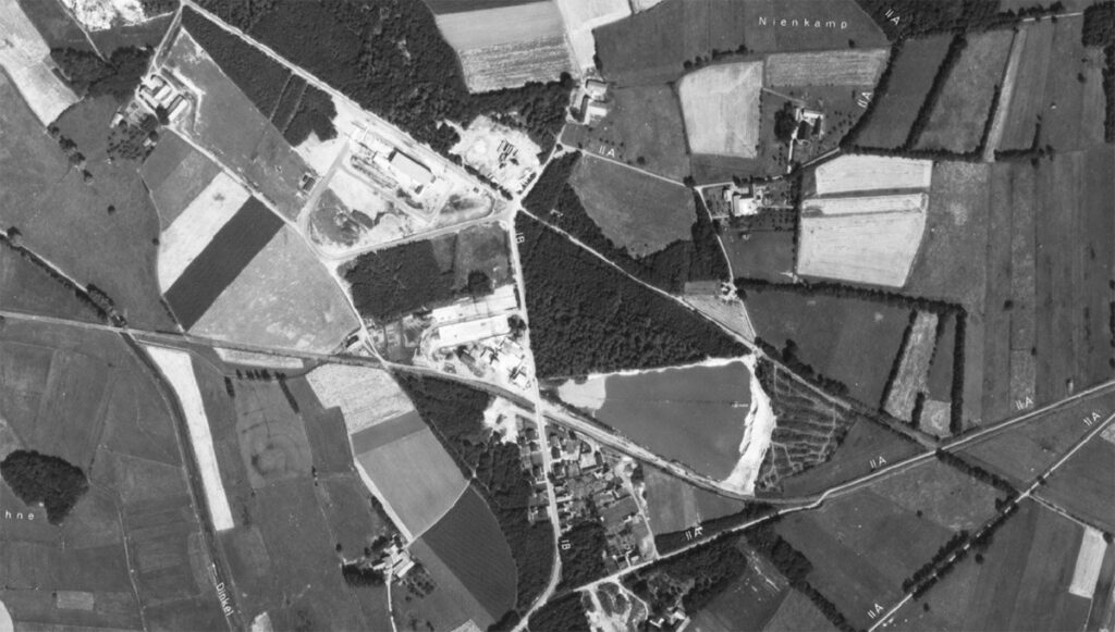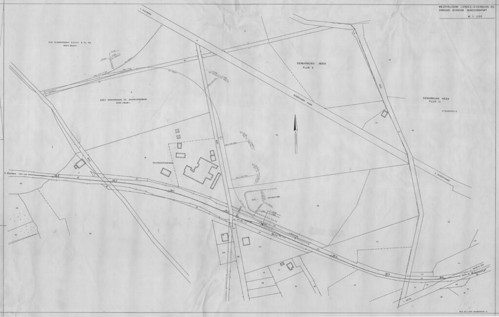 Auf der bisherigen Abbaufläche entsteht ein Gewerbegebiet. Hier wird ein neuer Anschluß für die Firma I.S.W. Elementebau GmbH (oben links) geplant. Dieser Anschluß wird aber nicht mehr verwirklicht. Der Betrieb zwischen Nienborg-Heek und Burgsteinfurt wird am 15. Oktober 1972 eingestellt, zwischen Ahaus und Nienborg-Heek am 28. September 1975.