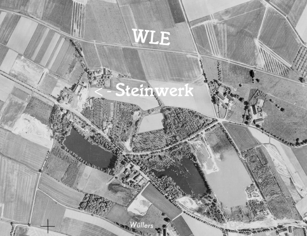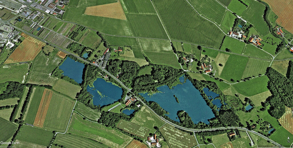 Schon auf dem Luftbild von 1962 sind die Wasserflächen über den Sandabbaustellen zu erkennen. Bis heute haben sich diese Flächen vergrößert.