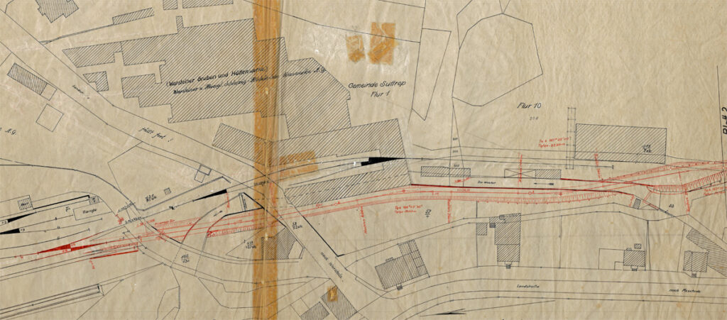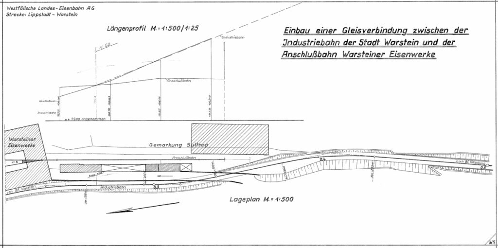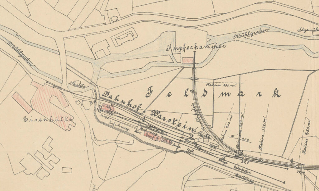 Bereits in den ersten Planung vor dem Bau der Bahn nach Warstein ist ein Gleis zur Eisenhütte vorgesehen.
