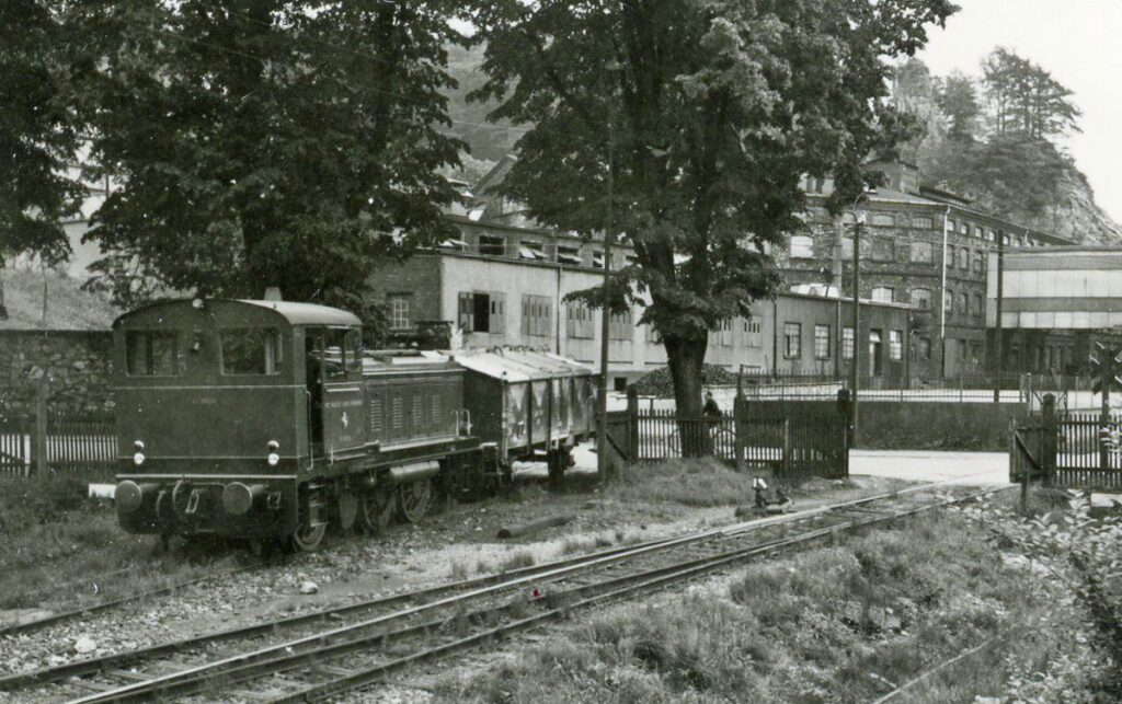 Da sich auch Betriebsteile der Hütte höher am Hang befanden wurde in den 1940er Jahren nach einer Lösung gesucht, Gleise auch in diesen Werksteil zu legen. Interessant zu sehen, wie stark die Industriebahn ansteigt.