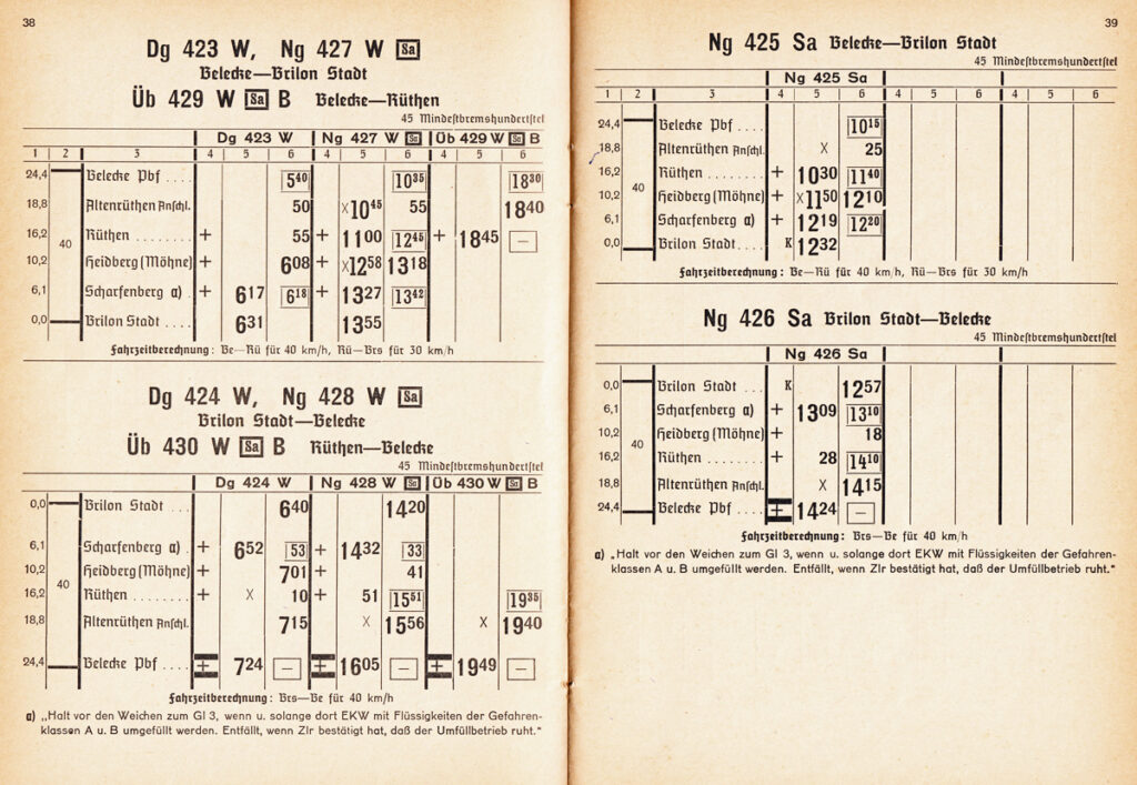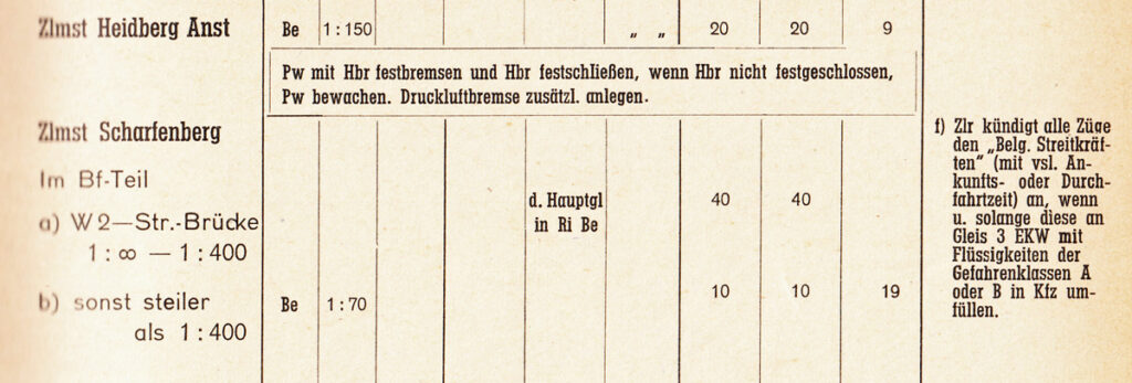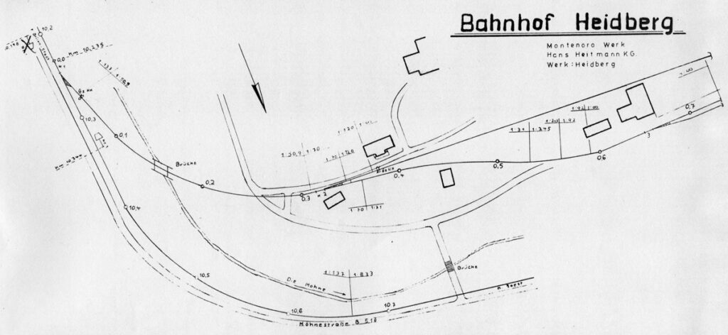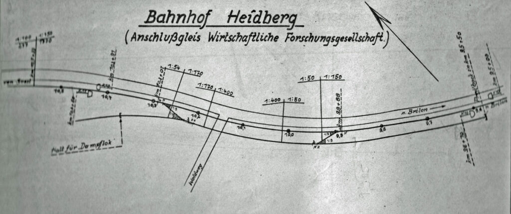 Dieser Gleisplan vom „Bahnhof Heidberg“ lässt die Zeit der Entstehung der Anlagen erkennen. Die „Wirtschaftliche Forschungsgesellschaft“ (WiFo) ist eine Gründung aus dem Jahr 1934, welche für die Beschaffung, Lagerung und Herstellung von kriegswichtigen Rohstoffen zuständig war und damit die Logistik der Wehrmacht sicherstellen sollte. In der Region Brilon wurden einige geheime Anlagen zur Herstellung und Lagerung von Kraftstoffen eingerichtet. Das Tanklager auf dem Heidberg gehörte dazu. Hier wurden die in den umliegenden Fabriken hergestellten Produkte gelagert und in Fässer oder Kanister abgefüllt. Über Anlieferung in Kesselwagen oder Abfuhr in normalen Güterwagen liegen keine Unterlagen vor. In einer Bereisung der Möhnetalbahn durch die Bahnaufsicht Münster am 12. November 1935 ist noch kein Bahnhof oder Anschluß Heidberg vermerkt.
