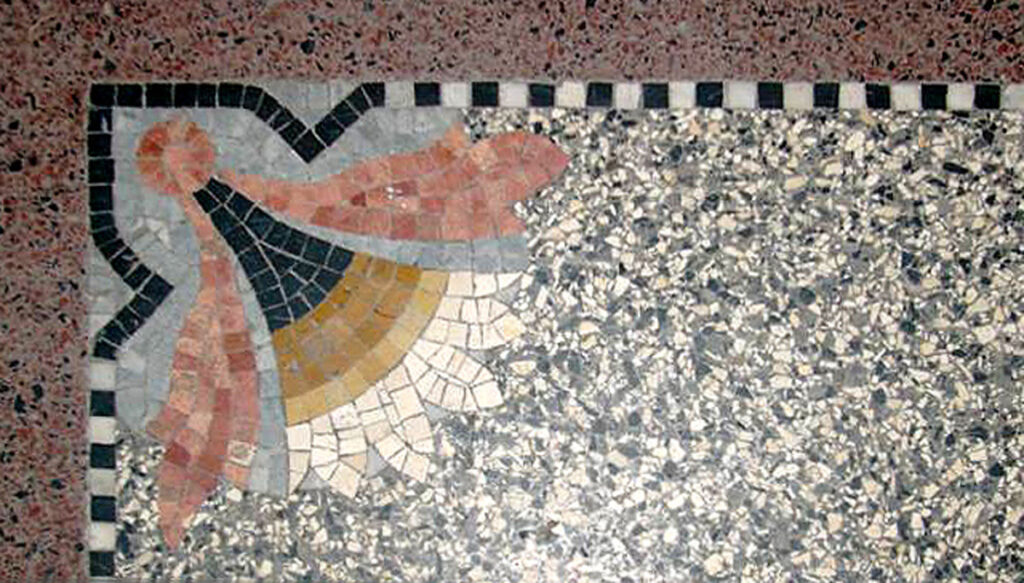 Fußbodenbelag unter dem Namen Terrazzo gibt es bereits seit der Antike. Anwendung hatte er in Kirchen und öffentlichen Gebäuden. Aber besonders seit der Gründerzeit wurde diese Art der Fußböden vermehrt eingesetzt. Neben Ziegelbruch wurden typischerweise Marmor, Kalkstein und Dolomit verwendet. Bis in die Zeit des Wiederaufbaus nach dem zweiten Weltkrieg wurde Terrazzo auch in Wohngebäuden für Böden in Treppenhäusern, Küchen und Bädern verwendet. An der Möhnetalbahn der WLE waren und sind einige Zulieferer für dieses Handwerk ansässig. Zur weiteren Vertiefung hierzu sein der in den Quellen genannte Beitrag aus der ARD.Mediathek empfohlen.