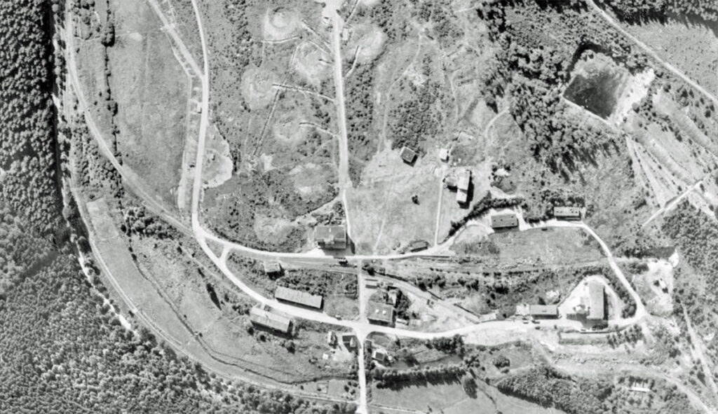 Auf dem Luftbild sind noch Jahre nach Kriegsende die runden Flächen der Lagertanks und der Löschteich oben rechts zu erkennen. Es wird erzählt, dass die Elemente der Tanks von der britischen Army abgebaut und in England zu einem neuen Tanklager wieder errichtet worden sein sollen.