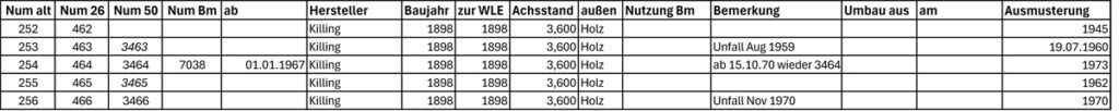 Die wechselnden Nummern der Wagen und ihr Werdegang sind aus der obigen Tabelle ersichtlich. Der erste Wagen schied schon nach 1945 aus. Wagen 3464 wurde zwischen 1967 und 1970 als Bauzugwagen genutzt und als letzter 1973 ausgemustert.