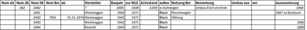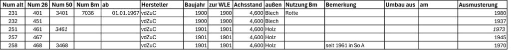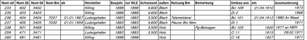 Auch hier ist die Vergabe der Wagennummern undurchsichtig. Einige dieser Umbaufahrzeuge mit Uraltfahrwerk blieben lange im Baudienst erhalten und zwei Fahrzeuge kamen sobar noch zu Museumseisenbahnen.