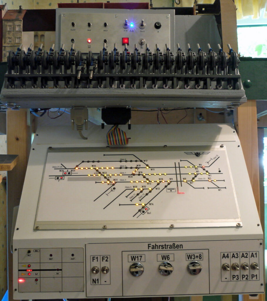 Es ist ein schematischer Gleisplan mit Ausleuchtung durch gelb / grün wechselnde LED vorhanden, Bedienelemente sind im Gleisplan nicht enthalten.