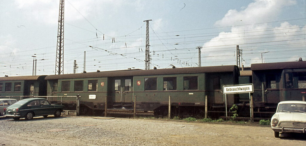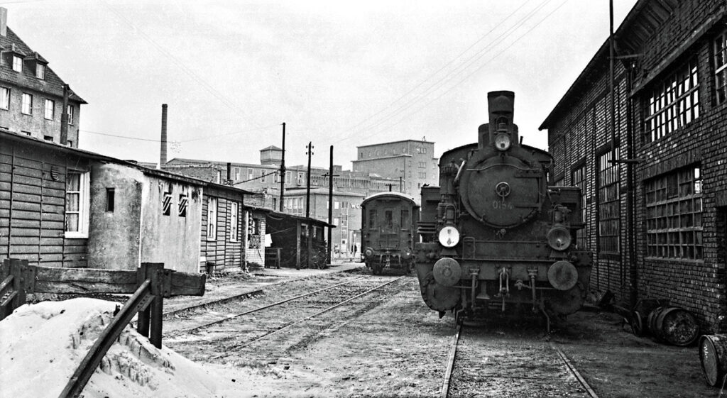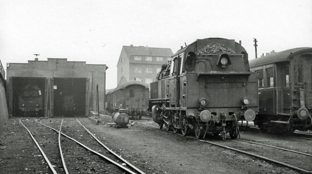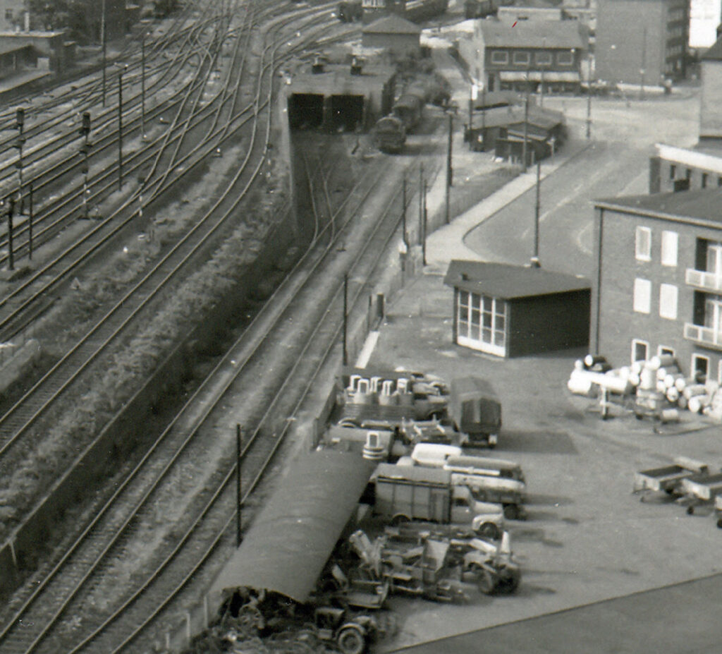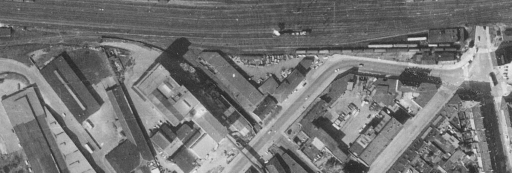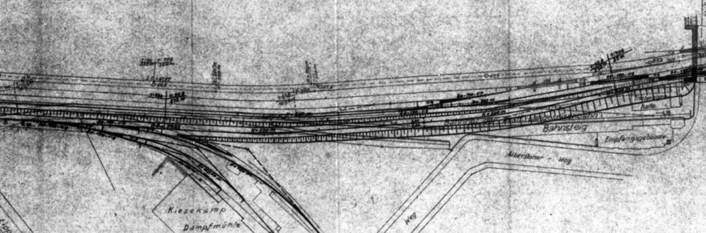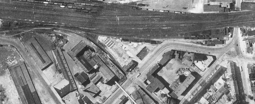 Gut zu erkennen die freigeräumte Fläche rund um die ehemalige Triebwagenhalle. Nach 1964 wird diese nicht mehr benötigt, da der Lokschuppen in Münster Ost zur Verfügung steht. In den Abstellgleisen stehen einmal fünf und zweimal 2 Wilhelmshafener Wagen.