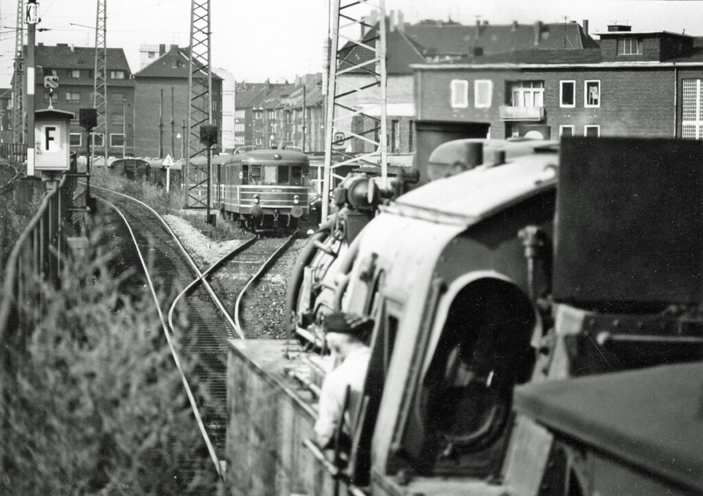 Der Fotograf beobachtet die Zustellung der Wagen aus Münster Ost zum Güterbahnhof. Die Rangierfahrt ist an diesem Tag sehr lang (siehe auch Fotos in Münster 4.1). So muß sehr weit in Richtung DB Personenbahnhof vorgezogen werden. Die Sperrsignale „P“ vom Hbf und „C1“ aus dem alten Personenbahnhof sind von hinten zu sehen. In den Abstellgleisen die Personenwagen und der VT 1021 mit VS 1522 in der Pause.