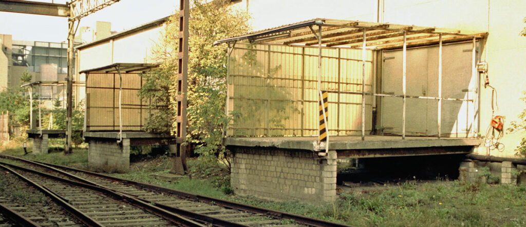 Eine Überdachung schützt den Bereich des Bodentrichters für die Getreideanlieferung. Oben, unter diesem Dach, befinden sich die Rohrleitungen für die Befüllung und sind die Silowagen oder BT Behälter vor dem Wetter geschützt.