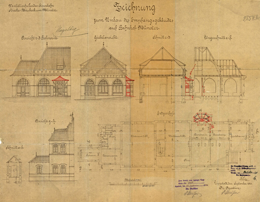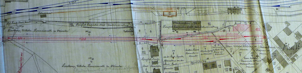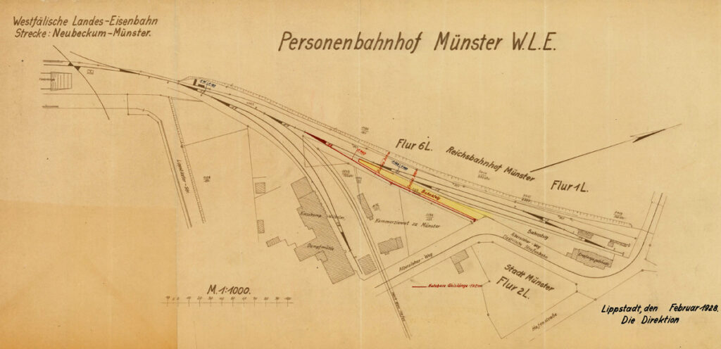 Am 21. Nov 1899 wurde die königliche Genehmigung für den Bau der WLE Strecke erteilt. Zu diesem Zeitpunkt waren die Verhandlungen über die Streckenführung und den Anschluß in Münster noch nicht abgeschlossen. Im Sommer 1902 wurde klar, dass es zu einer Mitbenutzung des Hauptbahnhofs nicht kommen würde, obwohl dies in der Konzessionsurkunde so festgeschrieben war. Es wurden verschiedene Pläne der Stadt und der Preußischen Eisenbahn vorgelegt.