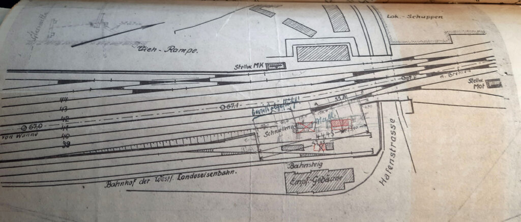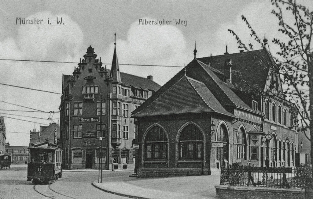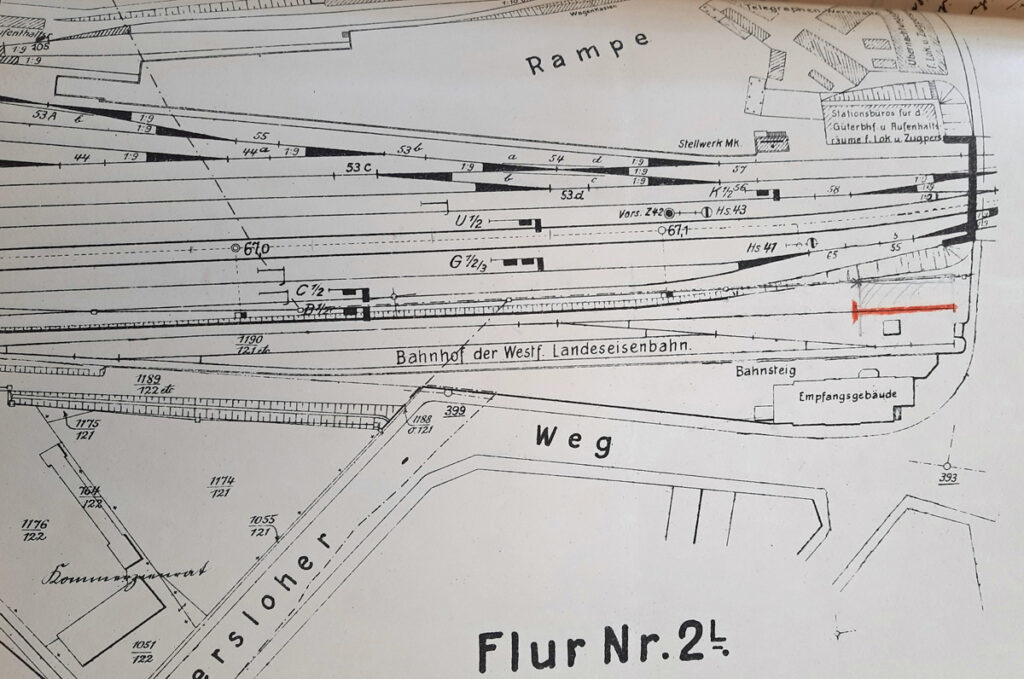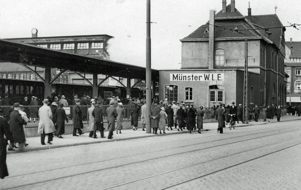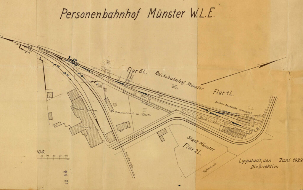 In den Stadtplänen der damaligen Zeit wird der WLE Bahnhof auch als Beckumer Bahnhof bezeichnet. Auf den Grundstücken zwischen Albersloher Weg und der Hafenstraße ist auf dem Luftbild nur das „Hansa Haus“ bereits errichtet. Das Empfangsgebäude der WLE liegt etwas versteckt hinter diesem.