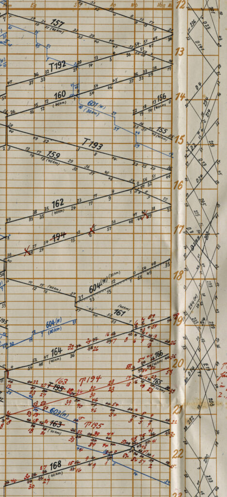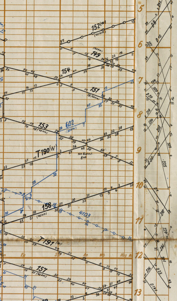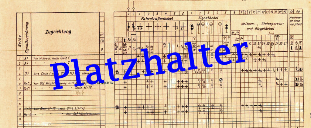 Der Plan für den Nachmittag enthält 2 Abfahrten nach der Mittagszeit und einen Personenzug der nur bis Wolbeck und zurück fährt. Der T 193 schein eine Art Eilzug zu sein, es sind keine Haltezeiten auf den Unterwegsbahnhöfen eingetragen.