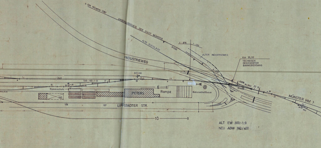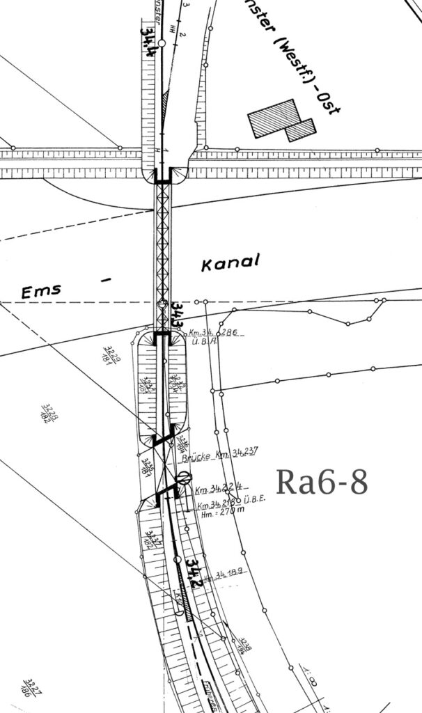 Auf einem Gleisplan vom September 1954 ist neben dem Einfahrgleis auf dem Damm vor der Kanalbrücke ein sog. Abdrücksignal (Ra6-8) eingezeichnet. Aus Erzählungen von alten Bahnern ist mir bekannt, daß die bunt gemischten Eingangswagen umfahren und dann aus Richtung Neubeckum schiebend über die Kanalbrücke abgedrückt wurden und mit der Schwerkraft in die Gleise 2 bis 4 rollten. Die Weichen waren alle ortsbedient. Wie viele Rangierer waren wohl in einer solchen Aktion beschäftigt mit: Weichen stellen, Hemmschuhe auflegen, Abdrücksignal bedienen?
