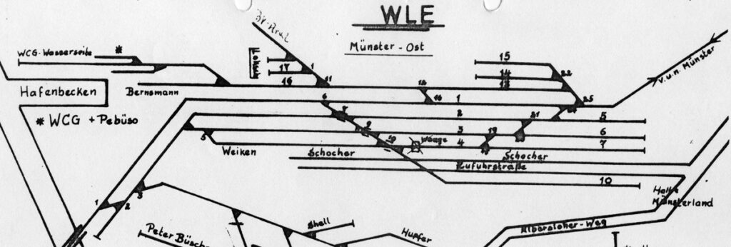 Wohin fuhren früher die Güterwagen im Einzelwagenverkehr? Neben den Kunden, die an der Ladestraße im Bahnhof ihre Ware empfangen oder verladen haben gab es eine Vielzahl von sogenannten Privatanschlüssen. Ein Werk, Betrieb oder Lager hatte eine Weiche und ein Gleis, auf dem die Wagen bereitgestellt wurden. Auch bei der WLE im Bahnhof Münster Ost gab es einige dieser Anschlüsse. Viele eigenen sich für den Nachbau auf einem Modul.