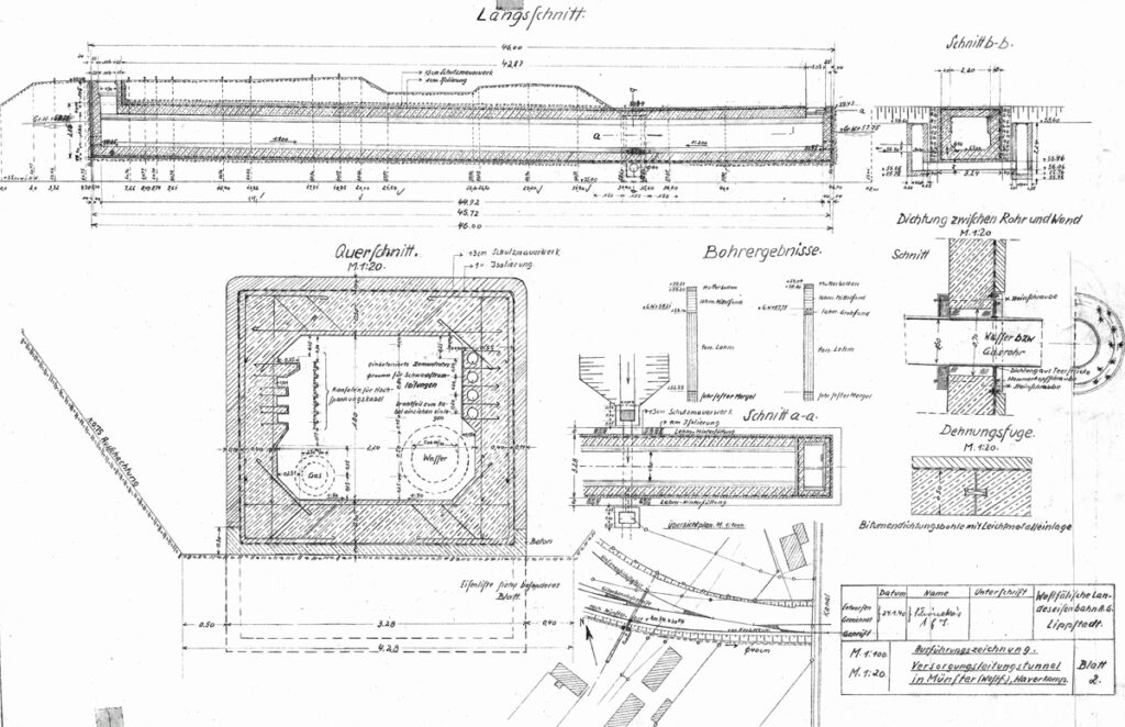 Auch die Grundstücke südlich der WLE Anlagen gehörten dem Bauunternehmer Büscher (siehen auch 3.1). Im Rahmen der Umbauarbeiten im Bahnhof in den 1940er Jahren wegen der neuen Kanalbrücke und der damit verbundenen Höherlegung der Gleise wurde zwischen beiden Betriebsteilen ein Verbindungstunnel angelegt.