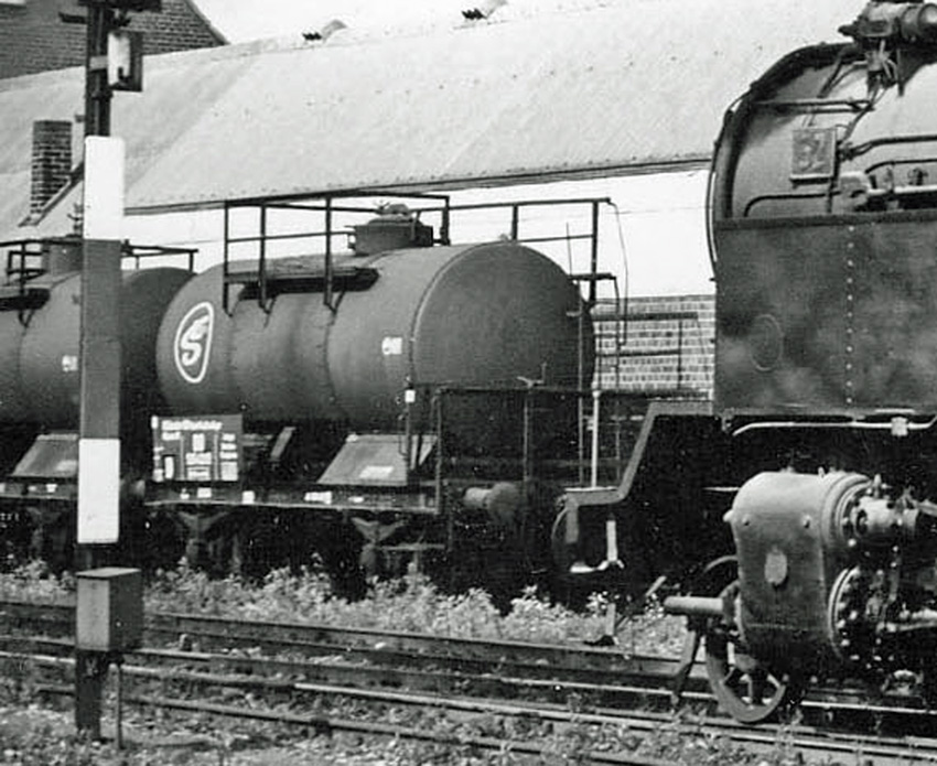 Im Hintergrund zu sehen: grüne Kesselwagen der Frima Schocher mit dem typischen Firmenlogo: der feuerspeienden Schlange, August 1967 (Foto: Löttgers, Archiv WLE)