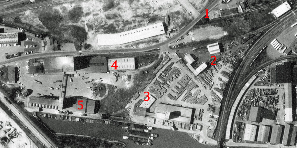 Noch ein Überblick auf einem Luftbild von 1968. Oben Rechts in der Ecke das helle Dach des neuen Lokschuppens. Nr. 1 der Anschluß Aral, Nr. 2 Bernsmann, Nr. 3 Büscher, Nr. 4 WCG Landseite, Nr. 5 WCG Wasserseite