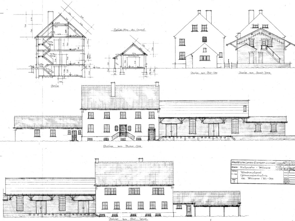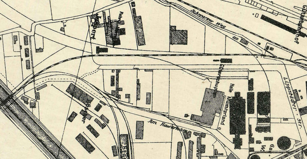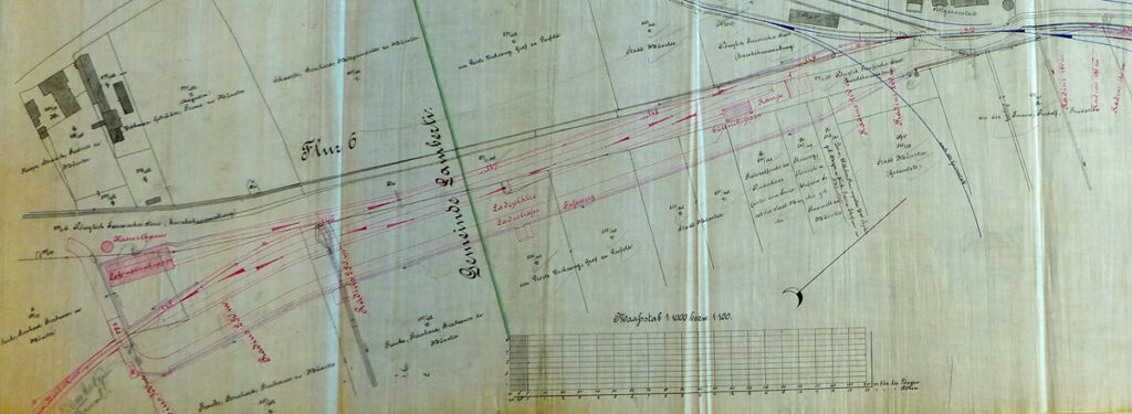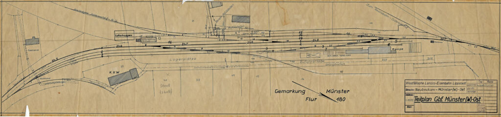 Die Gleisanlagen wurden nicht gemäß dieser Planung ausgeführt. Die wirkliche Gleislage ergibt sich aus den Plänen für die Anschließer in Münster Ost (siehe Beitrag „Münster 4.2“). Am oberen rechten Planrand ist der Anschluß zum Gaswerk und zum Stadthafen zu sehen. Für die Absicherung der hier vorhandenen 172 m gemeinsamer Strecke wurde in Münster das erste Stellwerk der WLE errichtet. Hierzu gibt es in den folgenden Beiträgen ausführlicheres.