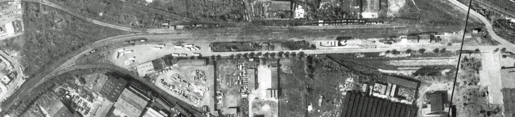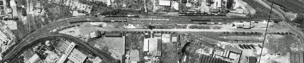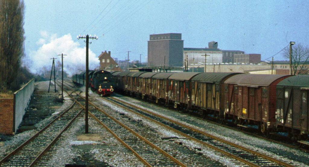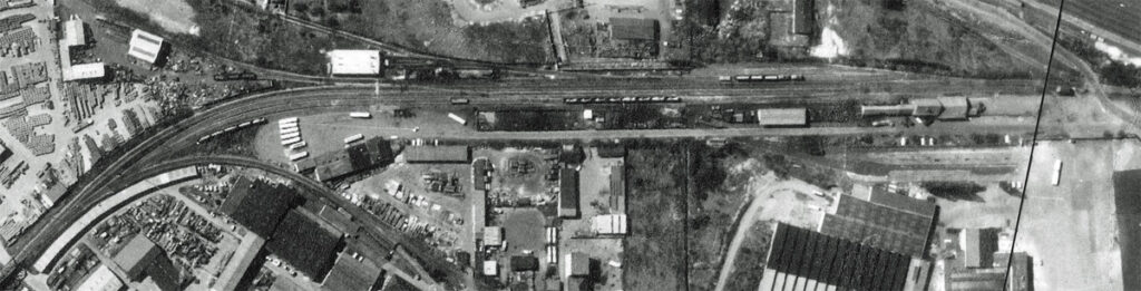 Viel weniger Güterwagen im Bahnhof gegenüber 1954, ein Lokschuppen ist noch immer nicht vorhanden. In Gleis 14 und 15 stehen weiterhin viele (Kessel?-) Wagen. Neu hinzugekommen ist das Gleis zur Centralgenossenschaft (WCG) oberhalb der Ausfahrtskurve. Es stehen viele Busse auf dem Hof vor der Garage der Kraftverkehr Westfalen (KVW).