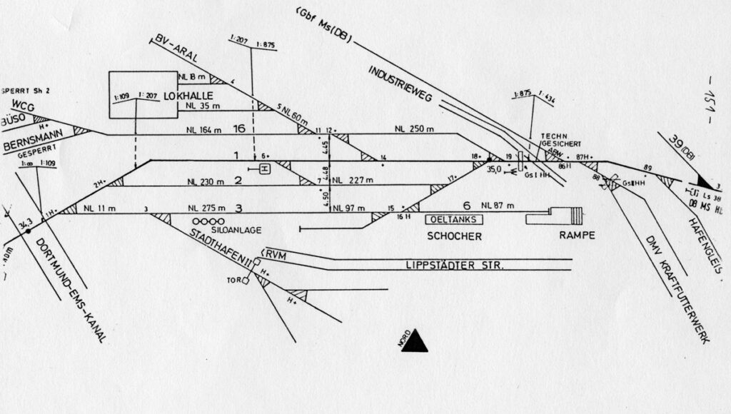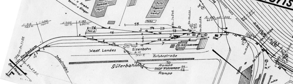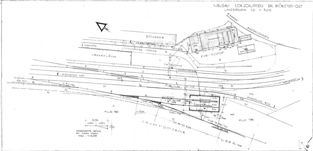 Nun gibt es einen Lokschuppen. Am Gleis zur WCG hat Bernsmann seinen Schrottplatz eingerichtet und Büscher nutzt die Restfläche im Dreieck für die Lagerung von Fertigprodukten. Am KVW-Platz stehen einige Otmm (Ed) Wagen mit Schotter, die wohl noch bei Teerschotter vom Streckengleis entladen werden sollen (siehe „Steine – auf Bf. Münster Ost“).
