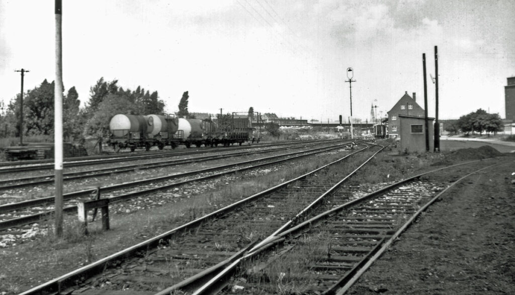 Auf den Gleisen der Viehrampe stehen Güterwagen und auch die Gleise 14 und 15 sind gut belegt. Einen Lokschuppen gibt es noch nicht wieder in Münster Ost, nur eine Kohlenbühne ist vorhanden. Auf Gleis 16 an der Kohlenbühne ist eine Personenzuggarnitur abgestellt. Auch die langen Wagen in Gleis 2 vor der DKW am Stellwerk können Personenwagen sein.