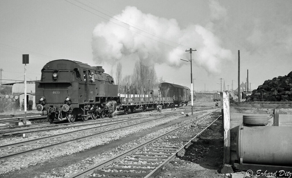 Am Zugende ist eine lange Reihe von Güterwagen zu erkennen. Da es ein Werktag /außer Samstag/ sein muß (5 Reisezugwagen) darf die Last für diese Wagen bis 200 to betragen. Diese wird mit den angehängten Wagen bestimmt erreicht.