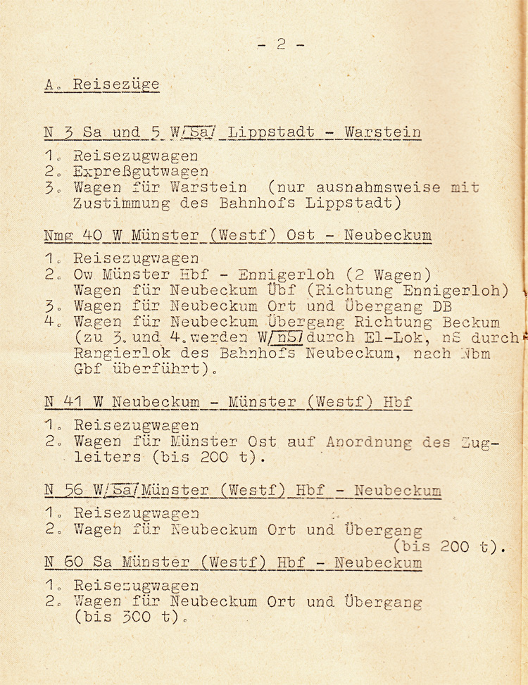 Über Pfingsten 1975 fanden zwischen Münster und Ennigerloh Dampfzugfahrten mit der ELNA BLE 142 aus dem Eisenbahnmuseum Bochum – Dahlhausen statt. Hierzu waren zwei weitere „Wilhelmshafener“ nach Münster abgeordnet worden. Somit ergab sich diese lange Reihe von neun Personenwagen.