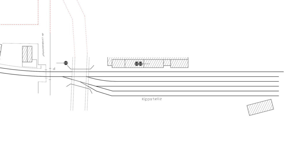Einige Gleise zum Ausrangieren der Eingangszüge waren von Anfang an in Neulippertor vorgesehen. Allerdings erwies sich der erste Wurf als zu kurz, so dass das Endstück erneuert und um 60cm verlängert wurde. Von der „Arbeitsseite“ schaut man auf die Häuserrückfronten der Kirchstraße.