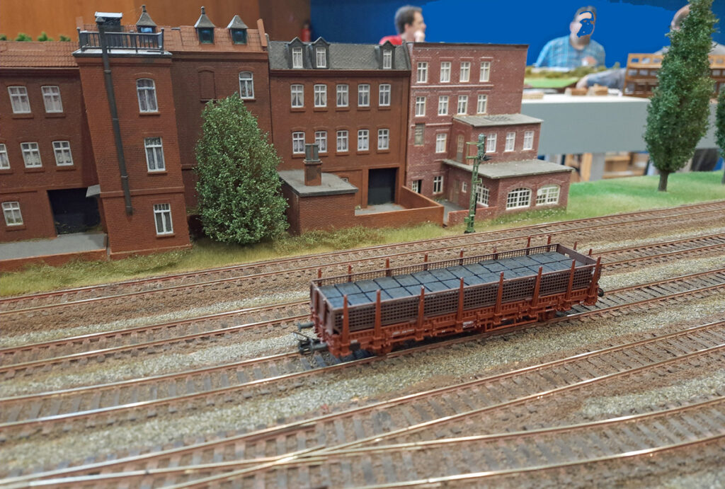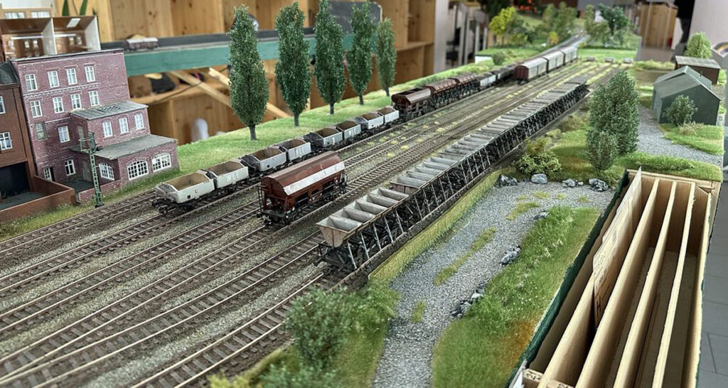 Es stehen zwei Gleise (21 und 22) mit jeweils 230 cm Länge, zwei kürzere Gleise (23 und 24) mit jeweils 170 cm Länge und das Gleis 25 mit der Kippstelle zur Verfügung. Das reicht, um die Ortswagen für Lippertor bereit zu stellen und ein bis zwei Nahgüterzüge für die WLE Strecke neu zu bilden. Über 50 Güterwagen finden hier Platz.